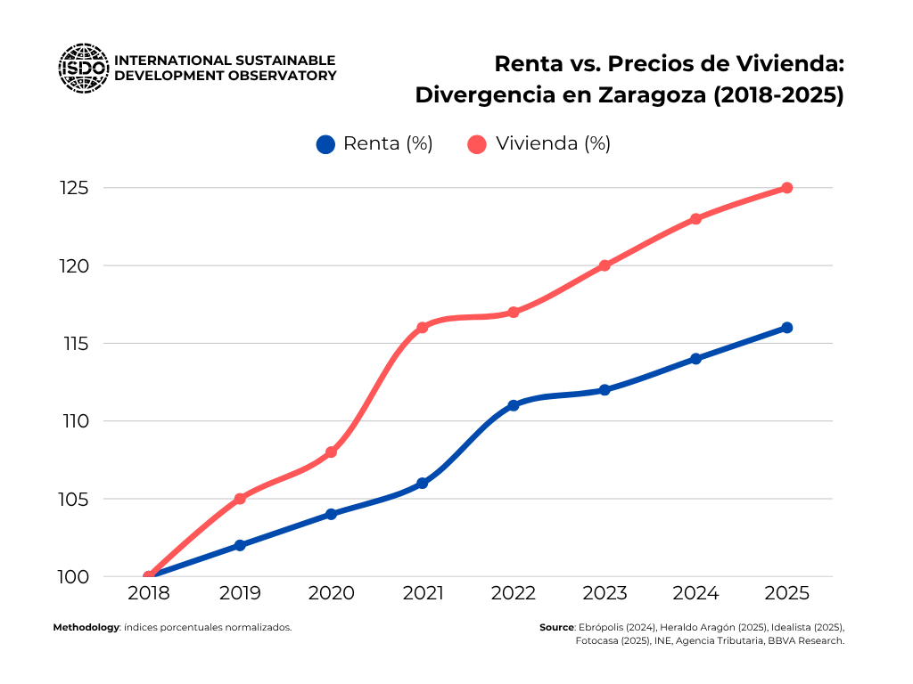 Pese a los esfuerzos regulatorios y de política pública, la accesibilidad a la vivienda permanece como desafío crítico en el territorio español. En particular, el acceso a vivienda para rentas medias se ha visto progresivamente comprometido por la divergencia sostenida entre evolución de precios y capacidad adquisitiva, fenómeno que se manifiesta con intensidades heterogéneas según el contexto urbano. Zaragoza, como ciudad intermedia de relevancia territorial y económica en el sistema urbano español, merece un análisis de profundidad que permita comprender tanto las dinámicas propias del mercado local como su posicionamiento comparativo respecto a grandes capitales tales como Madrid y Barcelona.