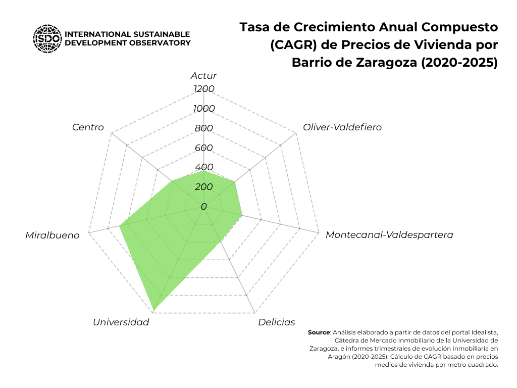 Precio de vivienda (€/m²): Obtenido de portales de referencia (Idealista, Fotocasa) con validación mediante series de INE y estudios de la Cátedra Mercado Inmobiliario UNIZAR. Refleja precio medio de compraventa residencial en Zaragoza ciudad.