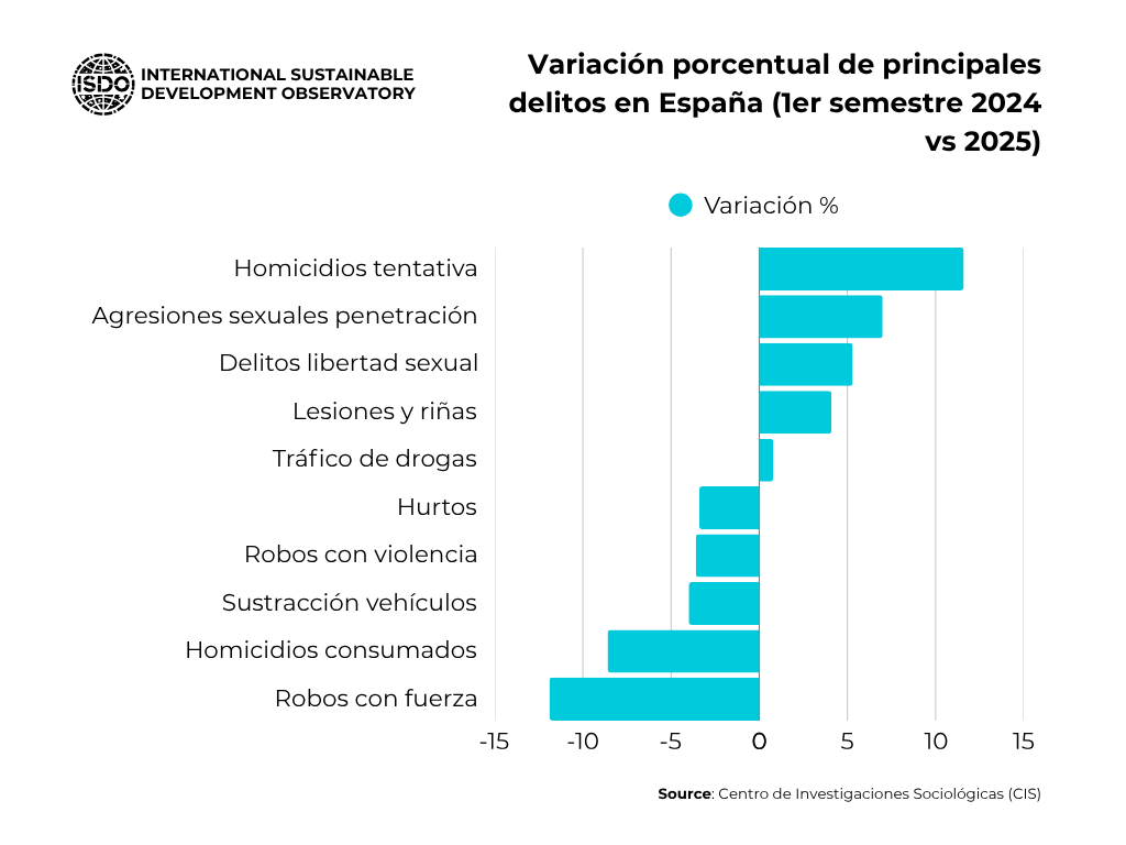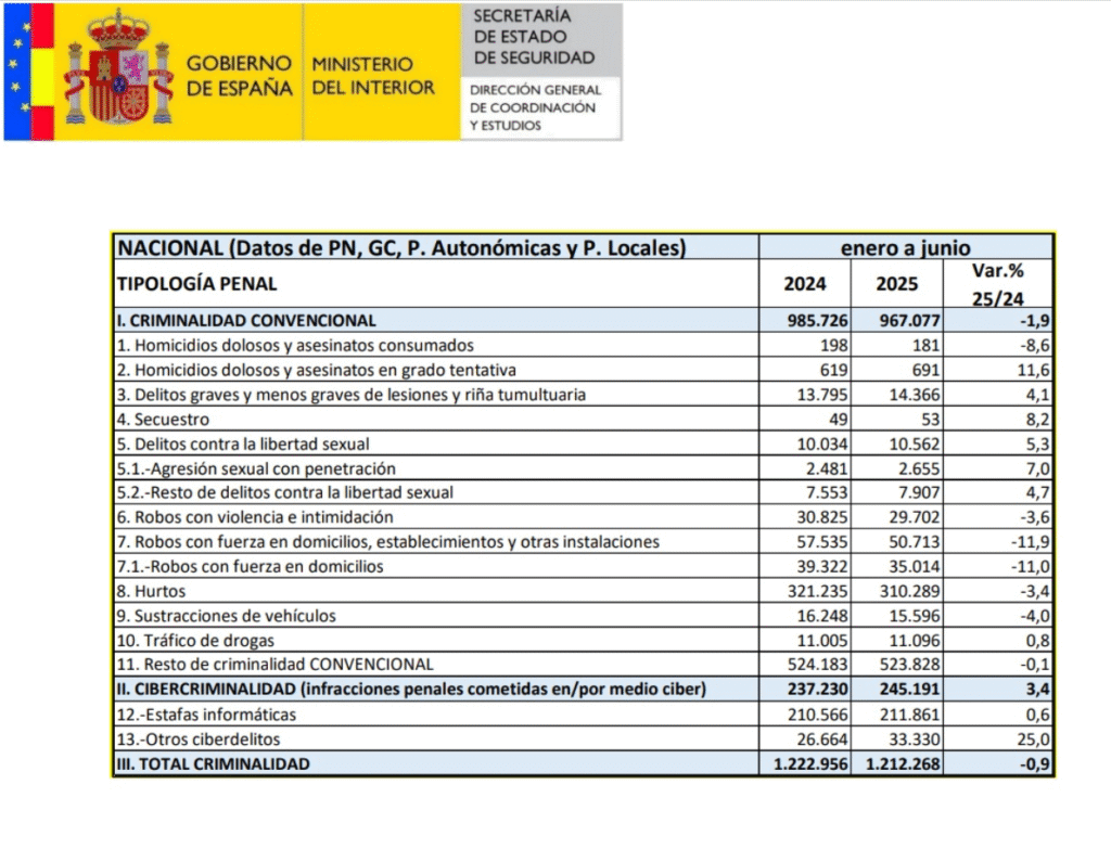 El primer dato evidente que se desprende de la tabla es que, tal y como señalan el Gobierno y los medios de comunicación, el índice de criminalidad en España ha experimentado un descenso del 0,9% en la comparativa entre el primer semestre de 2024 y el mismo periodo de 2025. Conviene subrayar que esta reducción se refiere únicamente a un intervalo parcial del año, por lo que no resulta posible aún establecer una comparativa anual completa. En términos generales, la afirmación es correcta si se limita al recuento absoluto de delitos y a la diferencia aritmética entre ambos periodos.