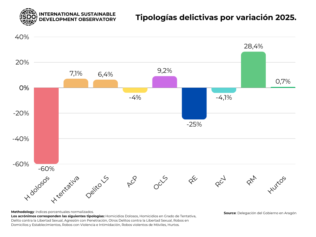 El informe toma como período de referencia principal el año 2025, con datos disponibles hasta el cuarto trimestre (Balance Anual del Ministerio del Interior). Se incluyen referencias a 2024 para comparativas interanuales. El ámbito geográfico es el término municipal de Zaragoza, desagregado en sus quince distritos administrativos.